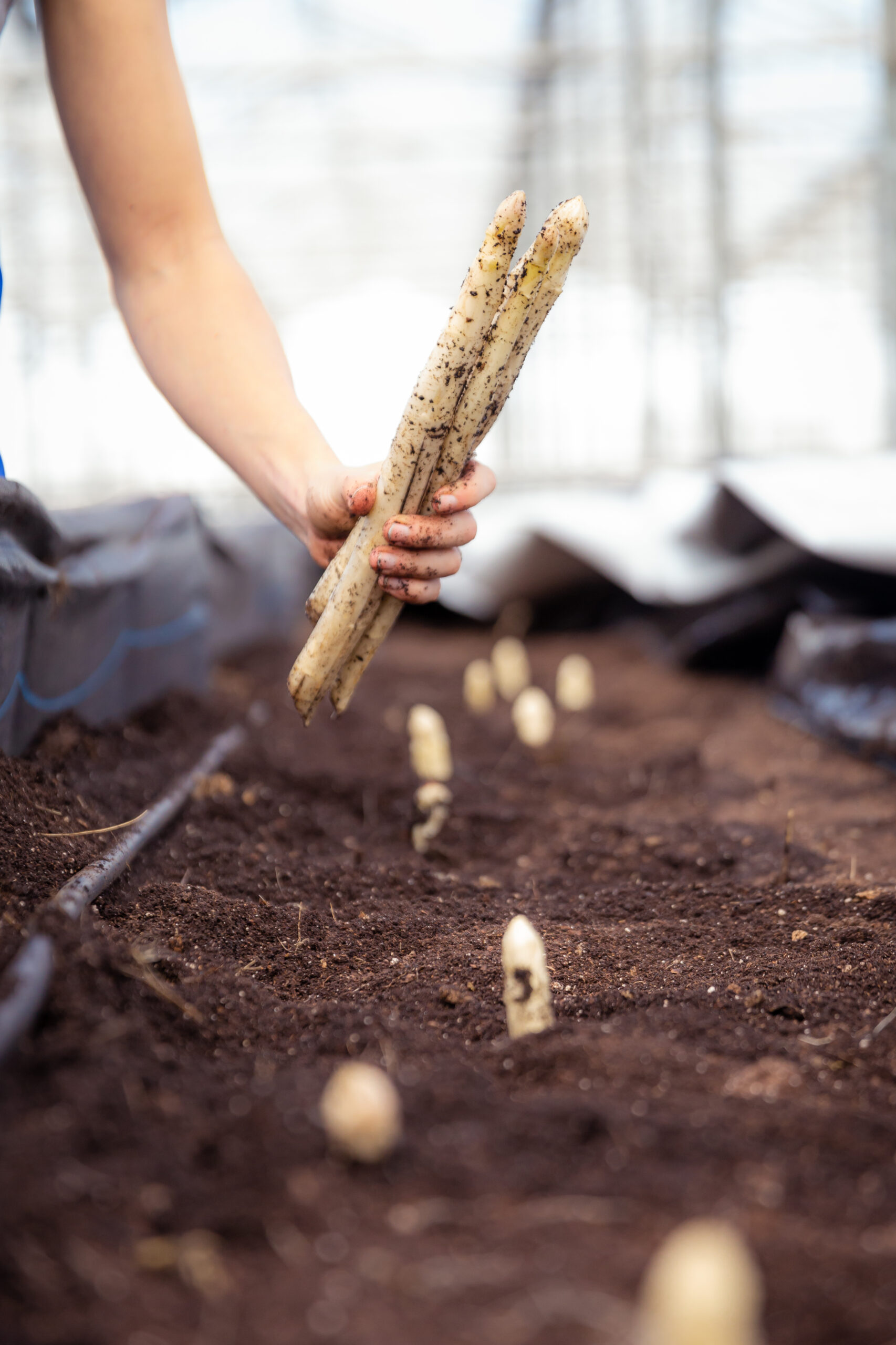 De aspergeplanten worden in het voorjaar een 25 cm onder de grond geplant. Het eerste jaar wordt er nog niet geoogst, de jonge planten moeten kunnen groeien en (zonne)energie opslaan in de wortels.