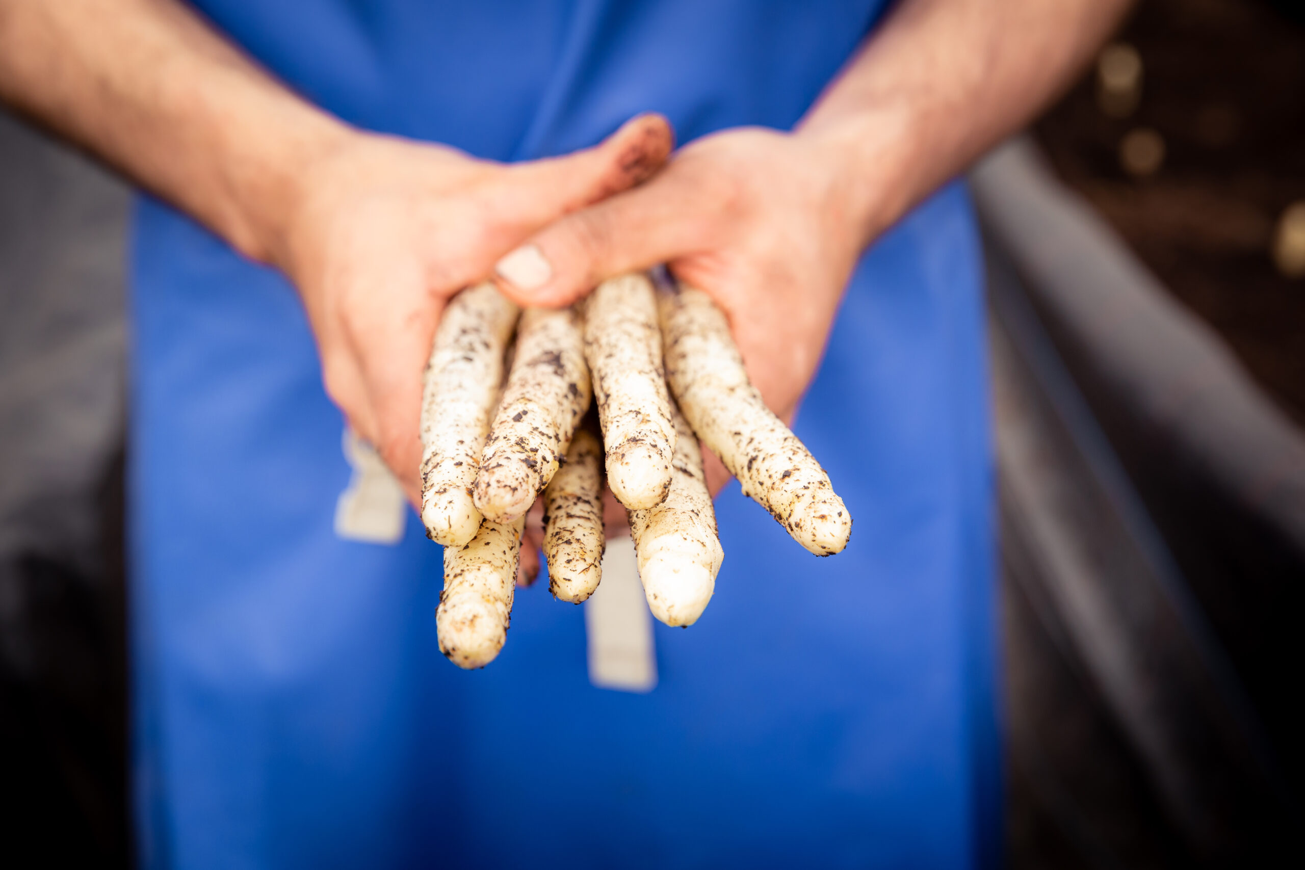 Groene asperges komen van dezelfde plant, maar ze zijn groen verkleurd omdat ze ‘het licht hebben gezien’. We oogsten ze dus niet onder de grond, maar boven de grond.